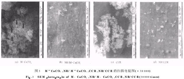 圖3是CCR和MCaCO3粉末、NR/CCR和NR/MCaCO3硫化膠的SEM圖,從圖中可見,MCaCO3粒子尺寸明顯比CCR粒子均勻,粒徑均為40~80nm的圓形顆粒.CCR和MCaCO3顆粒在NR硫化膠中分散均勻,但CCR界面清晰,部分粒子凸出于斷面表面,粒子表面無附膠,說明CCR與橡膠基體結(jié)合力弱;而MCaCO3大多數(shù)粒子被橡膠包埋,粒子與橡膠基體之間界面模糊,結(jié)合緊密,少數(shù)凸出于斷裂面的粒子表面有明顯的附膠,說明經(jīng)改性的碳酸鈣粒子與橡膠基體之間產(chǎn)生了較強(qiáng)的結(jié)合.