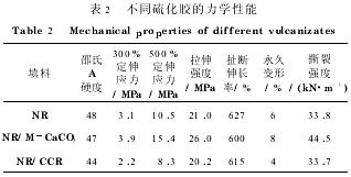 新型改性納米碳酸鈣MCaCO3在天然橡膠中分散性好,與橡膠基體形成了良好的結(jié)合,對(duì)天然橡膠具有顯著的補(bǔ)強(qiáng)作用,其效果明顯優(yōu)于商品化的硬脂酸改性超細(xì)碳酸鈣CCR.