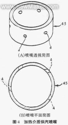 加熱介質噴嘴如圖4(A)所示為環形,與環座43可拆開裝配,因而二者形成一環形腔44。加熱介質噴嘴45有多個供汽口4與膠囊內腔6互通。這多個供汽口4按預先設定的間隔沿圓周方向分布。供汽口4的方向、數量和直徑根據輪胎尺寸選定。