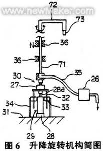 在圖6中具體標明了上下機構29和旋轉機構30,在此管71底端與旋轉馬達27相連,旋轉馬達27與氣缸28的推桿28a相連,氣缸28垂直安裝在硫化機底座31上。序號32代表抗轉桿,序號33代表滑動軸承,通過滑動軸承33,抗轉桿32可以滑過去,序號34是滑動軸承33的支座,垂直安裝在硫化機底座31上。管71底端也與軟管35相連并互通,軟管35與疏水器26相連。序號36代表硫化機底座的一部分,用以支承管71滑動及轉動。