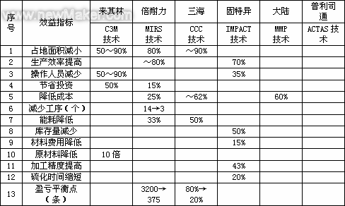 與傳統的輪胎制造工藝技術相比,上述全新概念工藝技術普遍具有節省投資、設備占地面積少、生產效率高、降低成本的優勢,詳見表1。