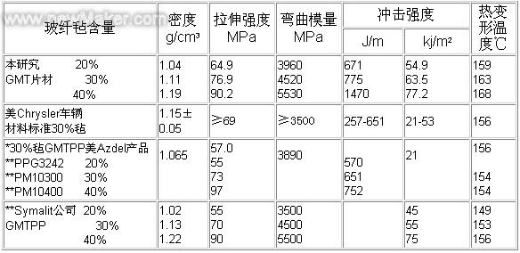 聚丙烯的力學性能與它的結晶度及球晶大小有關。低結晶聚丙烯性能差,當結晶度達到70%時其力學性能、剛性和耐熱性等均明顯提高。 改性后的聚丙烯增加了結晶度,流動性和滲透性,不僅提高了基體材料自身的各種性能,更重要的是提高了對玻纖界面傳遞載荷的能力,使樹脂能有效地將應力傳遞給模量和強度高得多的玻璃纖維,使樹脂對玻纖有良好滲透性和結合力。 2.3玻纖氈的選用及處理 國外GMT片材中的玻纖氈是玻纖公司專為熱塑性樹脂復合而開發的特殊專用氈,它是由E玻璃纖維經聚丙烯專用浸潤劑、偶聯劑等處理并用針刺法制成的原絲氈,這種氈極其膨松,有良好的懸垂性,適合熔融狀態下聚丙烯樹脂的浸潤。而國內供應熱塑性樹脂增強的針刺氈尚不成熟。我們將選用的國產玻纖氈,經過燒融,偶聯等予處理。引進的偶聯劑一端與樹脂基團結合,另一端與玻纖結合,就象一個個錨或釘子把樹脂與玻纖牢固地結合,能較好地充分浸潤。 2.4 GMT片材的制造工藝 GMT材料的制造工藝有粉末法、干法、濕法等。 濕法是以水為分散懸浮介質,先將纖維、樹脂粉末、乳膠、絮凝劑混合成懸浮液,粉末和乳液凝結,在液壓成形屏篩上分離出來。形成的氈在高于聚丙烯熔融溫度下壓緊,成GMT卷材。 干法也稱熔融浸漬法,它是用熱塑性樹脂熱熔冷凝的性能,在熱融熔態時設法使高粘度樹脂用特殊工藝手段并通過優化工藝參數使其透過界面,充分滲誘到玻纖氈中,即將二層玻纖氈層合在三層樹脂中,冷即后即成GMT片材。 3 性能對比 3.1 GMT材料性能 玻纖氈增強聚丙烯片材性能比較見表1。