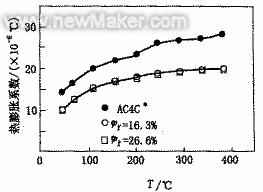 圖2 AC4C合金與K2O.6TiO2W/AC4C 復合材料的熱膨脹系數