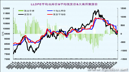 圖為LLDPE期貨價格與平均出廠價、平均現(xiàn)貨價對比圖。(圖片來源:文華財經(jīng) 卓創(chuàng)資訊)