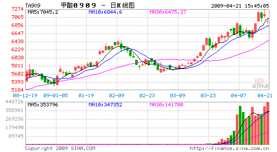 本周國(guó)內(nèi)PTA現(xiàn)貨市場(chǎng)突破7250 元/的的近七個(gè)月的新高后高位盤穩(wěn)。至周末為止國(guó)內(nèi)華東市場(chǎng)的一般現(xiàn)款自提貨報(bào)價(jià)和成交價(jià)位分別到7300 元/噸和7200-7300 元/噸,較周初暴漲近600 元/噸。外盤近洋現(xiàn)貨的一般報(bào)價(jià)和成交價(jià)位則分別在880-900美元/噸和880-890 美元/噸附近,較本周初上漲65 美元/噸。