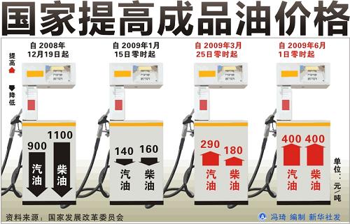 隨著國際油價(jià)隨后暴跌,自去年12月19日以來,我國成品油價(jià)格三次下調(diào),汽、柴油價(jià)格每噸分別降低2700元和2500元,其中包括取消養(yǎng)路費(fèi)等收費(fèi)的間接降價(jià)。1月15日成品油價(jià)格下調(diào)后,國內(nèi)油價(jià)已實(shí)際降到位。3月25日,根據(jù)國際油價(jià)不斷上漲的情況,國家將汽油、柴油價(jià)格每噸分別上調(diào)290元和180元。