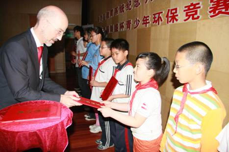 朗盛上海顏料有限公司總經理余文廣(Wolfgang Oehlert)為2009“朗盛杯”少兒環保競賽獲獎小選手頒獎