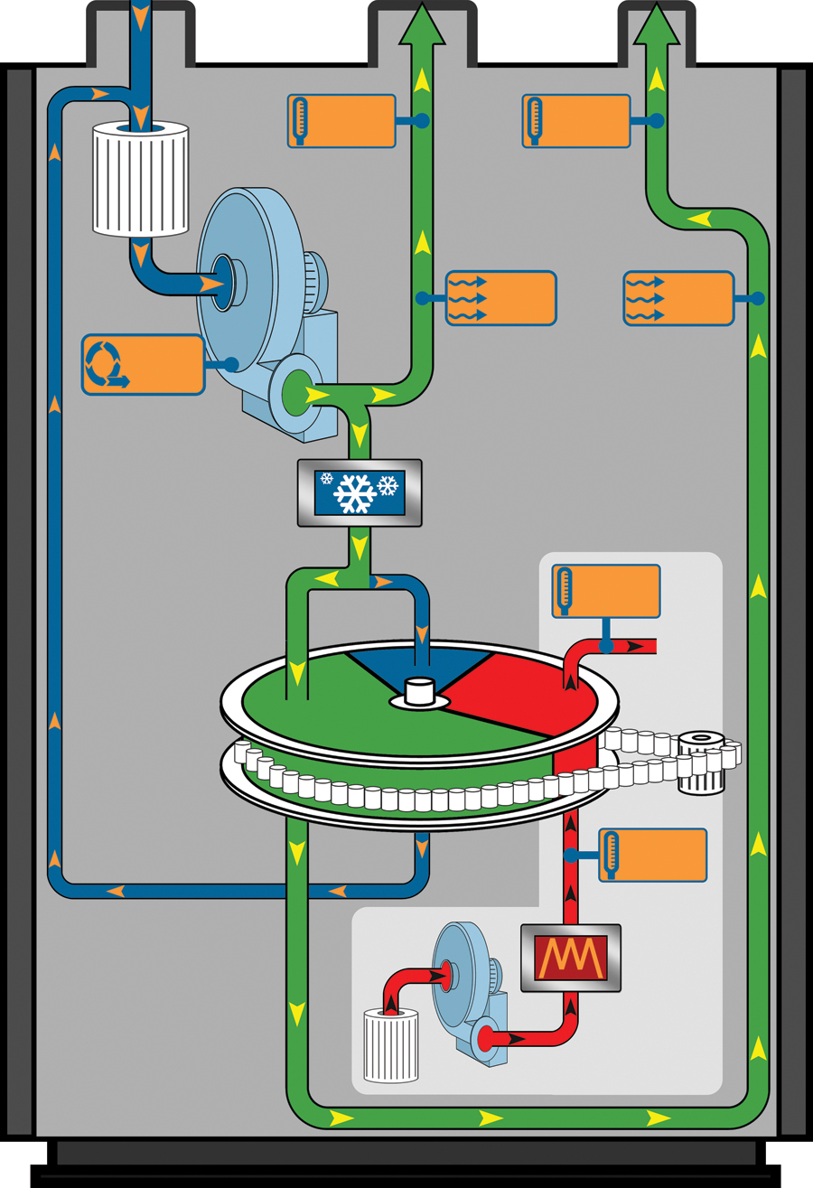 2. 內部的干燥機。空氣離開料斗頂部后進入左上方的干燥機,過濾后送入鼓風機,離開鼓風機時氣流一分為二。一股氣流冷卻后通過除濕輪,經重新加熱后送入料斗的底部區域。另一股氣流溫度仍比較高,幾乎不需要重新加熱即可送入料斗頂部區域。