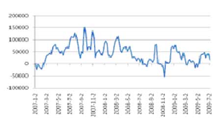CFTC最新持倉報告顯示,截止7月21日當周,NYMEX原油期貨合約基金多頭持倉較前一周減少2384手至191829手,空頭持倉增加11555手至189611手,基金凈多持倉減少13939手至2218手,當周基金興趣繼續偏向于空頭,而當周原油價格持續攀升,表明基金對原油價格漲勢持質疑態度。