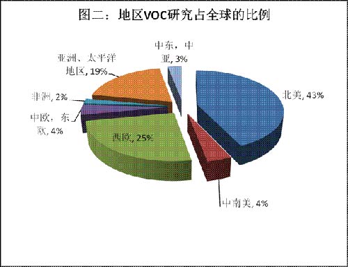 根據這項調查結果,減少VOC的含量的課題占全球環保涂料研究總量的48%。(圖一)在研究減少VOC含量的涂料科技人員中,43%來自北美,25%來自歐洲。亞洲排第三,占19%。(圖二)