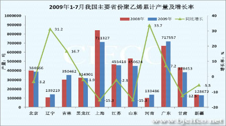 圖為2009年1-7月各省聚乙烯累計產量及同比增長率走勢圖。(圖片來源:卓創資訊 單位:噸,%)