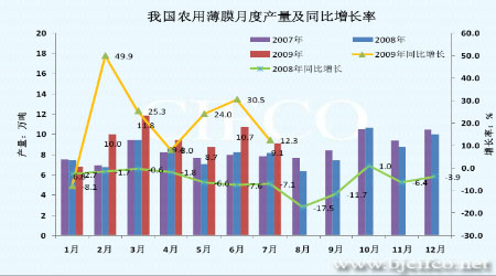 圖為2009年1-7月我國農用薄膜產量及同比增長率走勢圖。(圖片來源:卓創資訊 單位:噸,%)