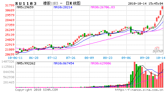 10月14日,上期所橡膠主力合約1103收盤價大漲4.24%,每噸31265元的結算價創下歷史新高。