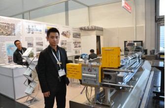 南京誠盟K2010現(xiàn)場展出一臺高扭矩高轉(zhuǎn)速75雙螺桿配混擠出機。擠出機扭矩8.7Nm/cm3,轉(zhuǎn)速可達800rpm。 公司國際貿(mào)易部主任李堯向記者介紹,最近幾年公司業(yè)務(wù)在巴西、伊朗、中東、南美等市場表現(xiàn)相當(dāng)好,下一步看好印度市場的發(fā)展。