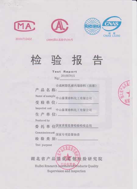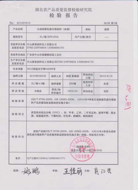 2010年9月6日,湖北省武漢市質(zhì)量技術(shù)監(jiān)督局受國(guó)家質(zhì)量監(jiān)督檢驗(yàn)檢疫總局委托對(duì)中山泰萊涂料有限公司的產(chǎn)品進(jìn)行抽查檢驗(yàn),抽查的合成樹(shù)脂乳液內(nèi)墻涂料(面漆)/5L/桶KP6100A為合格。