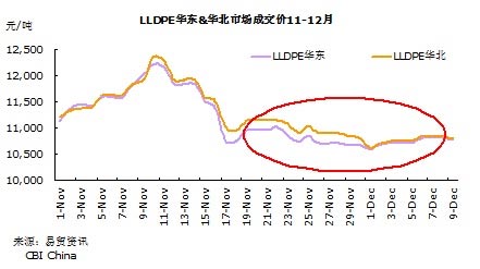 但事實上,11月下旬以來,若將超低價算入的話,LLDPE成交價格在10300-11000元/噸之間來回振蕩,行情未如市場人士所預期地反彈,而是經常以期貨的大幅下跌而挫傷市場人士樂觀的心態。