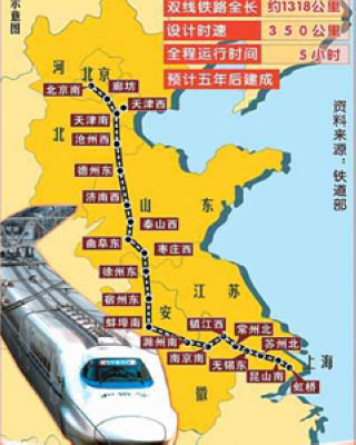 京滬高鐵于2008年4月開工建設,總投資超過2209億元,預計5年內建成。據悉,截止2010年1月7日京滬高鐵累計完成投資1224億元,為總投資的56.2%。