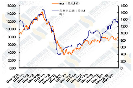 圖為PTA現(xiàn)貨價(jià)格與亞洲PX價(jià)格走勢(shì)圖。(圖片來源:西南期貨)
