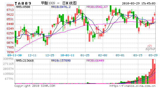 PTA:本周PTA主力合約自1005逐步轉移至1009合約上,PTA1009合約價格周一至周四基本在8300-8500元之間徘徊,并且盤中價格區間震蕩范圍很小,然而,本周五的一根大陽線似乎使PTA有短期擺脫震蕩區間的跡象。我們從1009合約K線圖中看出,周五價格曾突破前期高點,可遺憾收盤價格略有回落,但這并不影響對短期內PTA可能會形成小反彈。