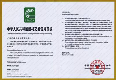 2010年以來,為配合并推進(jìn)建材下鄉(xiāng)的進(jìn)程,中國建筑材料流通協(xié)會對建材行業(yè)的規(guī)模以上企業(yè)進(jìn)行了交易信用等級評估。4月,中國建筑材料流通協(xié)會委托北京益信健信國際信用管理有限公司對廣東巴德士化工有限公司進(jìn)行信用等級評定。整個評定過程遵循獨(dú)立、客觀、公正、科學(xué)的信用評價原則,以《中國建筑材料流通協(xié)會建材交易信用評價標(biāo)準(zhǔn)體系》為標(biāo)準(zhǔn)依據(jù),對巴德士公司的企業(yè)基礎(chǔ)信息、社會信用記錄、企業(yè)財務(wù)狀況進(jìn)行審核,最后評定該公司的信用等級為AA級。