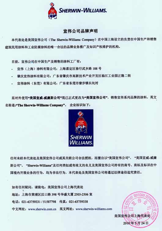 任何未經本代表處及美國宣偉公司或其關聯公司合法授權,而擅自以“美國宣偉公司”、“美國宣威-威廉斯公司”、“Sherwin-Williams”及任何類似或有歧義的名義及美國宣偉公司持有的商號、商標及標識在中國境內開展業務的行為,均為非法行為,本代表處及美國宣偉公司將通過法律途徑追究責任。