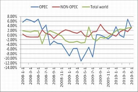 中國原油需求從金融危機逐步恢復,并已經超過2008年的需求高點。而全球原油需求從金融危機的84.1百萬桶/日,目前逐步復蘇至86.3百萬桶/日,仍未恢復至經濟危機前的高點(87.4百萬桶/日)。2010 年1季度全球原油40%的增量來自中國。2010 年前5個月中國原油進口量達到9569萬噸,較上年同期增長37%,5月份進口原油1784萬噸,較上月的新高略有下降。