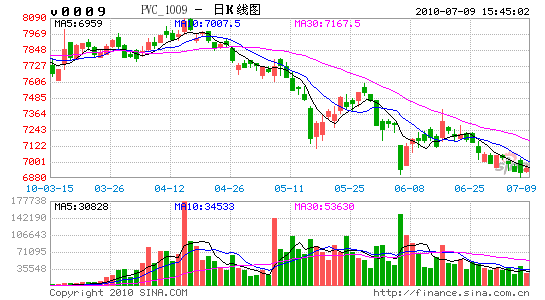 年初PVC期價沖高受阻,隨后因中國人民銀行意外上調三個月央票發行收益率大幅跳水。之后原油大幅回調,現貨市場維持弱勢,需求持續疲軟,加上1月合約交割造成部分低價貨源沖擊現貨市場,PVC期貨順勢下跌。但受成本支撐,期價回落至7250附近后觸底反彈。春節長假過后的第一個交易日,PVC期貨大幅跳空高開,但隨后受獲利盤離場、現貨市場成交持續疲弱等因素影響,期價再度震蕩下行,回落至7300-7500區間震蕩盤整。受良好的經濟數據提振,加上期貨倉單注銷對市場的沖擊小于預期,3月下旬起期價再度走高。但 “高盛欺詐事件”、歐元區債務危機等事件引發全球金融市場動蕩,4月下旬期價自高位開始回落。盡管電價上調對PVC形成一定成本支撐,但金融市場利空頻出、國內房地產調控政策連續出臺,PVC期貨一路震蕩走低,目前已回落至7000元整數關口附近。