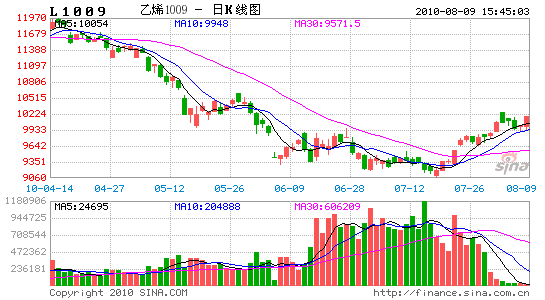 七月份以來,連塑期價(jià)9月合約在上中旬維持兩個(gè)多星期的低位整理行情,并上半月的最后一個(gè)星期中走出五連陰形態(tài),期價(jià)創(chuàng)下9060的年內(nèi)新低價(jià)格。自7月19日,在國(guó)內(nèi)A股市市場(chǎng)率先反彈的帶領(lǐng)下,連塑價(jià)格也走出一輪超跌反彈行情。下半個(gè)月,國(guó)際油價(jià)震蕩走高,石腦油價(jià)格止跌企穩(wěn),刺激塑料價(jià)格一路上升,9月合約價(jià)格直逼10000整數(shù)關(guān)口。