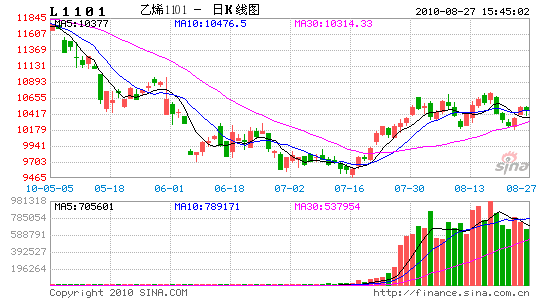 繼7月下旬大幅反彈后,8月份LLDPE期貨維持高位震蕩格局。本月主力合約L1101開于10400,盤中最高10735,最低10180,尾盤報收于10465,上漲130點,漲幅1.26%,成交量大幅增加1263.3萬手至1444.4萬手,持倉量增加78670手至19.2萬手。
