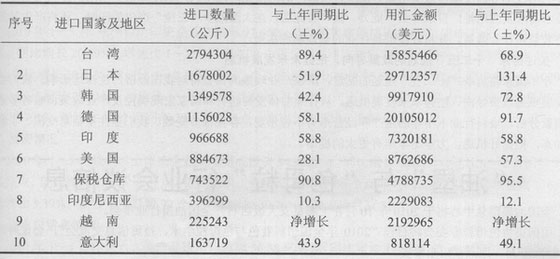 今年上半年有機顏料進口的國家413個。值得注意的是越南對我國有機顏料出口進入前十,我國有200多的噸的進口量,是一個新的動向。有機顏料進口前3位的國家沒有變化,進口日本的有機顏料同比增加51.9%,用匯同比增加131%,這種現象需要引起我們業界的關注。有機顏料進口前十名的國家和地區詳細見下表: