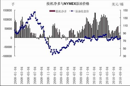 北京時間2010 年9 月24 日周五晚間,美國商品交易委員會(CFTC)公布的數據顯示,截止9 月21 日當周,NYMEX 的原油期貨總持倉為1324114 手,比上次報告減少一萬余手,其中投機多空均有所增倉,這也顯示油價在75 美元/桶附近依然存在分歧,當周投機凈多頭為43900 手,比上周的48337 手有所減少,但比上上周的僅1 萬手出頭已經大幅增加。從CFTC 公布的持倉數據我們可以看出一個規律,就是每次油價在75 美元/桶下方尤其是接近70 美元/桶時,總有大量的投機資金入場推高油價,2009年底以來油價每次均在接近70 附近觸底反彈,這可以看出投機資金對70 這個關口支撐力度的信心,而每次油價在接近80 美元/桶時,投機多頭亦明顯減倉。從投機持倉的變化看,市場更傾向于認為油價將會在70~80 美元/桶這個區間內波動。