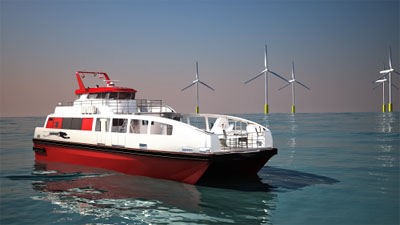 自九月中旬起,首只CarboCAT雙體船,23米長(zhǎng)的CarboClyde已開始在德國(guó)能源供應(yīng)商EnBW公司的波羅的海的一號(hào)海上風(fēng)電場(chǎng)工作。該船只的航海速度大約是每小時(shí)25海里,最多可承載8噸的材料和12-24名技術(shù)人員。