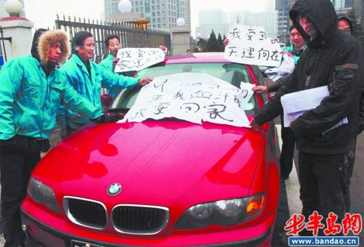 中遠(yuǎn)匯麗干粉涂料有限公司負(fù)責(zé)人劉經(jīng)理的寶馬車旁,農(nóng)民工們打出討薪標(biāo)語。