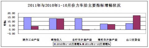 2011年1-10月份工業總產值同比增長4.16%,銷售收入同比增長13.15%;主導產品中自行車外胎產量同比下降0.78%,電動自行車外胎產量同比增長16.02%,摩托車外胎產量同比增長6.28%。出口交貨值與去年同比增長17.14%;出口率(值)19.59%,同比增長2.17個百分點。