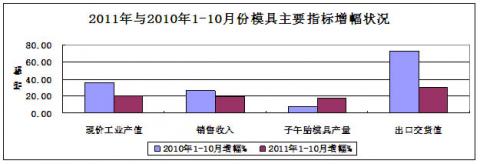2011年1-10月份現價工業產值同比增長19.86%,銷售收入同比增長19.86%;子午胎模具產量同比增長17.30%。出口交貨值同比增長29.95%;出口率(值)為15.30%,與去年同期相比增長1.2個百分點。