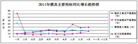 機械模具26家重點企業2011年與2010年1-10月份份模具主要指標增幅對比狀況見圖20,2011年模具主要指標同比增長趨勢狀況見圖21。