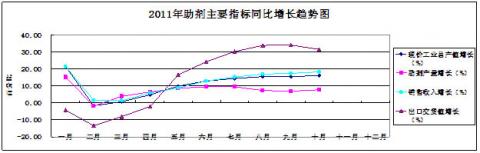 橡膠助劑45家重點企業2011年與2010年1-10月份橡膠助劑主要指標增幅對比狀況見圖22, 2011年橡膠助劑主要指標同比增長趨勢狀況見圖23。