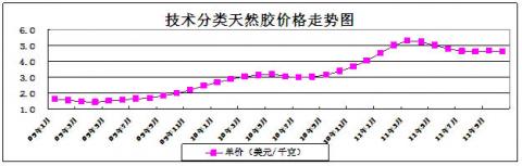 根據中國海關數據統計,10月份進口技術分類天然膠16.49萬噸,與上年同期相比增加48.9%,與上月環比下降6.54%;進口額7.58億美元,與上年同期相比增加102.9%,與上月環比下降8.06%。進口其它未硫化的初級形狀復合橡膠4.73萬噸,與上年同期相比下降23.9%,與上月環比下降19.7%;進口額2.2億美元,與上年同期相比增加4.5%,與上月環比下降20.0%。2009年以來的技術分類天然膠價格走勢狀況見圖24。