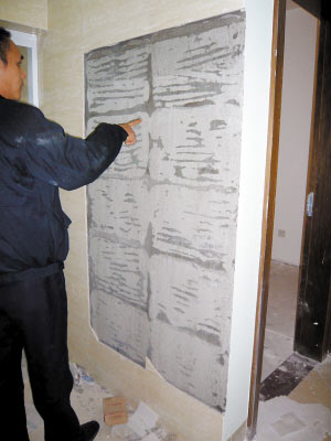 今年9月中旬,吳先生發現衛生間墻壁1.8米以下的瓷磚出現裂紋、空鼓、崩角等現象。到9月底,有幾塊瓷磚脫落摔碎在地面。隨后,吳找來鋪瓷磚的工人詢問,對方說是因為防水層脫落造成的。防水公司工作人員稱,瓷磚脫落處不是他們做的防水層,而是開發商交房時的防水層。后來吳了解到,小區內類似情況不只他一家,于是他又把情況通知了小區物業,小區物業又報告給了施工方。