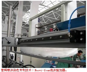 據譽輝總經理王興南介紹,噴入式泡沫染色機利用了泡沫施加技術,并解決了傳統染色機的泡沫在橫向施加不勻的問題。該機結合譽輝的噴沫染色的專利技術,使活性染料的染色過程從傳統的軋-烘-軋-蒸的流程縮短為目前的噴沫-烘干流程,可使活性染料的連續染色能源節約超過40%以上。