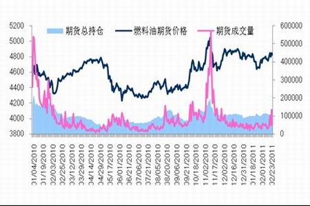 自2010年10月起,燃料油期貨庫存開始快速累積,目前已經(jīng)升至高達53萬噸。由于去年10月份資本市場推高了期貨價格,不少現(xiàn)貨庫存轉(zhuǎn)移至期貨倉庫,當(dāng)前整體燃料油持倉僅為11.5萬手,與庫存數(shù)量基本吻合,市場存在較大的拋壓。