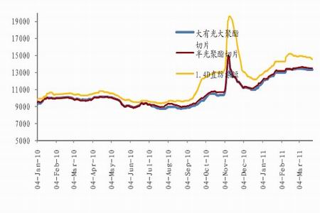 原油在100-106 美元高位震蕩,對PTA 價格形成一定支持。上游PX 沖高回落。4—5月烏石化100 萬噸供應市場,韓S—OIL 新裝置投產,中海油惠洲裝置恢復到正常水平,日本地震對PX 造成的影響在逐漸減弱,國內4—5 月的部分PTA 裝置檢修對PX 用量減少,PX 現貨市場心態發生變化,本周PX 價格從1768 美元/噸回落至1723 美元/噸。近期PX 利潤也在下降,周五PX 與MX 之間的差價下降到513 美元/噸,比地震后3 月14 日的620 美元/噸利潤下跌100 美元/噸。后期PX 與PTA 之間的價格引導關系或將有較大轉變,即由前期的PX 強勢引導PTA 走勢轉向PTA 漲跌反過來影響PX 走勢。