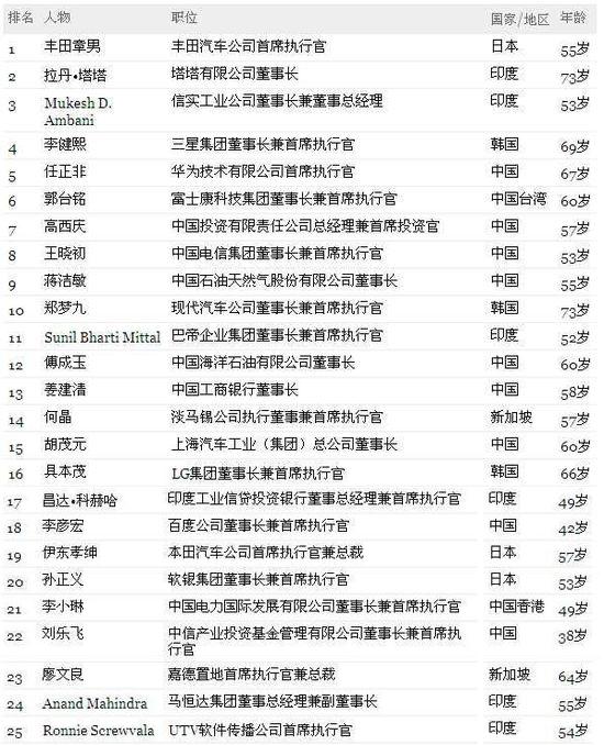 “亞洲最具影響力的25位商界領袖”榜單