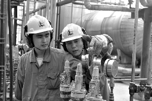 揚子石化烯烴廠緊貼市場,對丁二烯裝置副產品丁二烯二聚體實現充分回收與初步沉降分離,成功降低了二聚體中的水含量,生產出了適合市場需要的二聚體產品進行外銷。今年上半年,共生產二聚體104噸,副產品碳四抽余油2萬多噸。圖為該廠員工正在進行工藝操作,降低二聚體中的水含量。