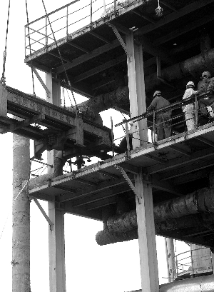 大慶石化公司煉油廠上周首次在不停工的情況下更換冷卻器芯子一次成功。此前,該廠常減壓裝置因冷卻器內(nèi)漏,嚴(yán)重影響裝置的安全生產(chǎn)。為了消除隱患,該廠首次嘗試在線更換冷卻器芯子,保證了正常生產(chǎn)。圖為技術(shù)人員在現(xiàn)場(chǎng)工作。