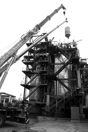 八月五日,大慶石化公司化工三廠裝置大檢修圓滿結束,實現了檢修裝置開車一次成功,生產出合格產品。此次檢修涉及苯乙烯、ABS、SAN、乙苯脫氫、聚丙烯、橡膠制品共六套裝置,檢修項目共有六百一十二項。圖為該廠苯乙烯裝置檢修現場。