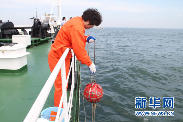9月2日,國家海洋局監測人員在溢油事故現場取樣核查。 9月2日,國家海洋局認定康菲公司“兩個徹底”沒有完成,責令蓬萊19-3全油田停注、停鉆、停產作業。康菲公司向國家海洋局提交關于“兩個徹底”綜合報告兩天后,新華社記者乘坐中國海監15船于9月2日11時許終于到達溢油事故現場海面,發現現場仍然有油帶漂浮,并有油花冒出,清污工作仍在繼續。新華社記者 羅沙 攝