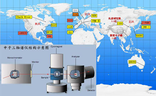世界主要中子散射用戶平臺分布與中子三軸譜儀的結構示意圖