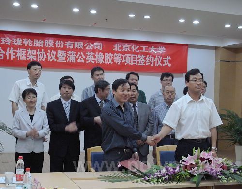 山東玲瓏輪胎股份公司董事長兼總經(jīng)理王峰與張立群教授簽約蒲公英橡膠開發(fā)項目合同