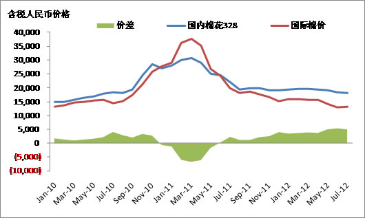 如上圖所示,國內外棉花價差在2012年逐漸拉大,每噸價差已達5000元,國內棉紡企業競爭力被大幅削弱,市場份額也被迅速搶占。據海關資料顯示,2012年前五個月,中國棉花進口量達到258萬噸,比去年同期的121萬噸增加了113.8%,而棉紗前五個月的進口量已超55萬噸,比去年同期的36萬噸增長了55%,預計今年棉紗的進口將超120萬噸。其中從產棉區印度和巴基斯坦的進口增長尤為明顯,說明在外棉強大的價格優勢之下,中國的棉紡織業在市場化環境中受到了極大的沖擊。